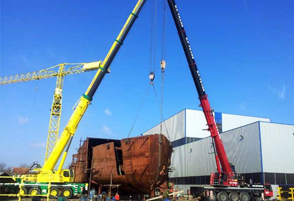 Montiranje konstrukcije broda u brodogradilištu u Perlezu pomoću dve autodizalice nosivosti 120 i 220t.